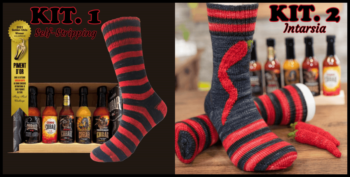 Two versions of Cobar Socks Knitting Kit WITH Hot Sauce gift set... Are you ready to add some spice to your knitting?