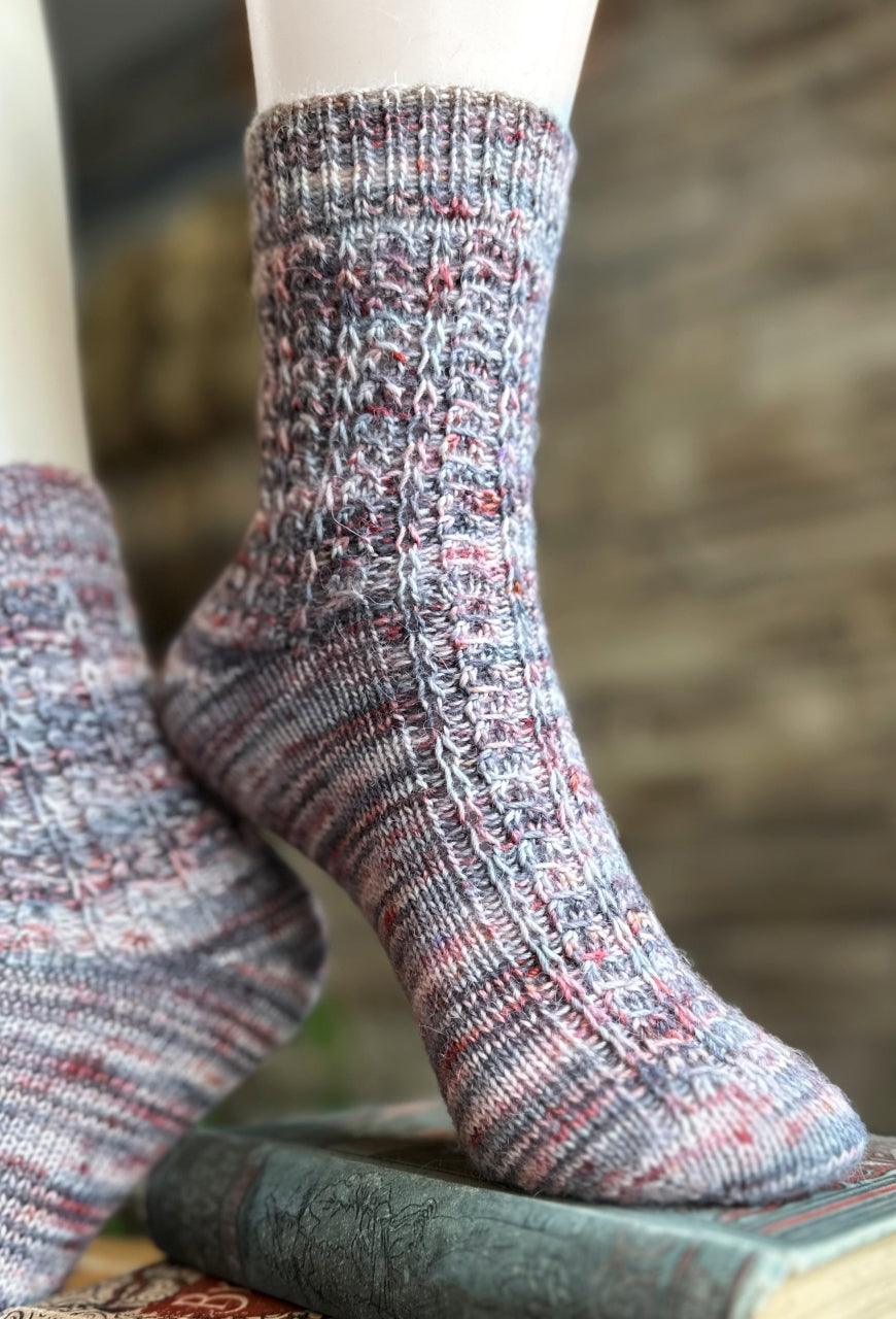 This beautiful design, created by Jill Tamminen, showcases a delightful textured stitch pattern and a Sisu Heel. Originally designed for the Biscotte Mystery Sock Club - January 2023. Now you have the option to purchase the pattern by itself or the knitting kit, which includes both the yarn and pattern required to knit this project.