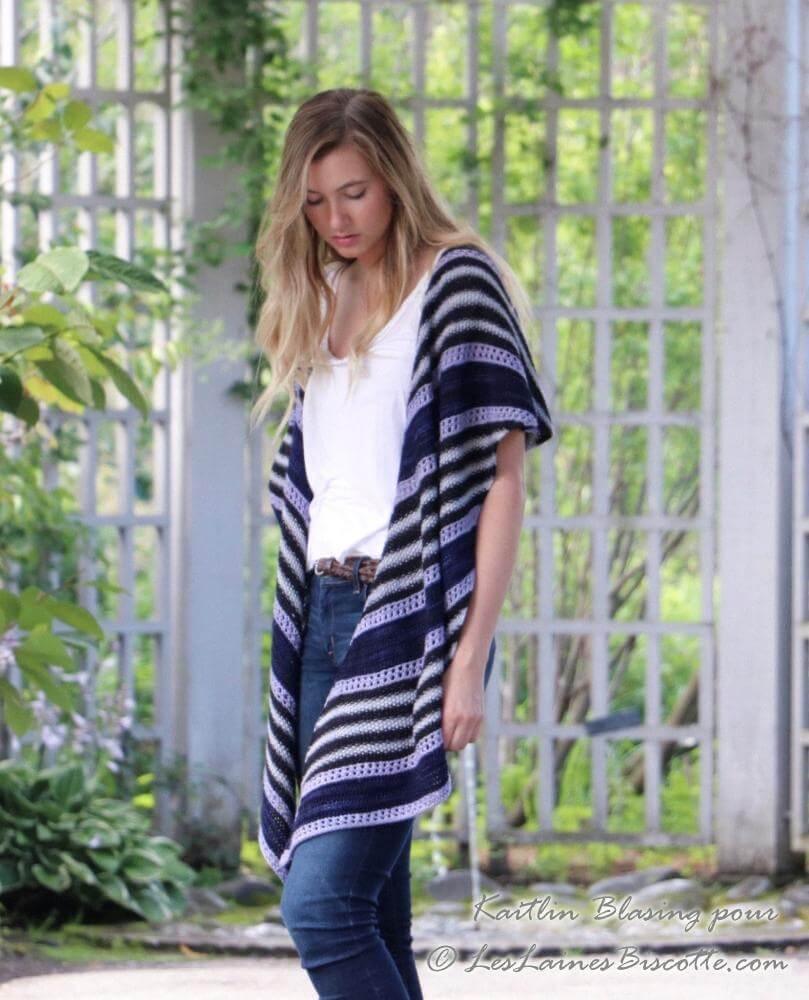 This beautiful Cascading Angles Shawl uses self-striping yarn and coordinating colors to create intricately textured stripes. The unique shape of this shawl is both enjoyable to knit and functional as a finished item. This shawl can be worn in many ways and is sure to find a home in your wardrobe! An original design by Kaitlin Blasing for Biscotte Yarns.