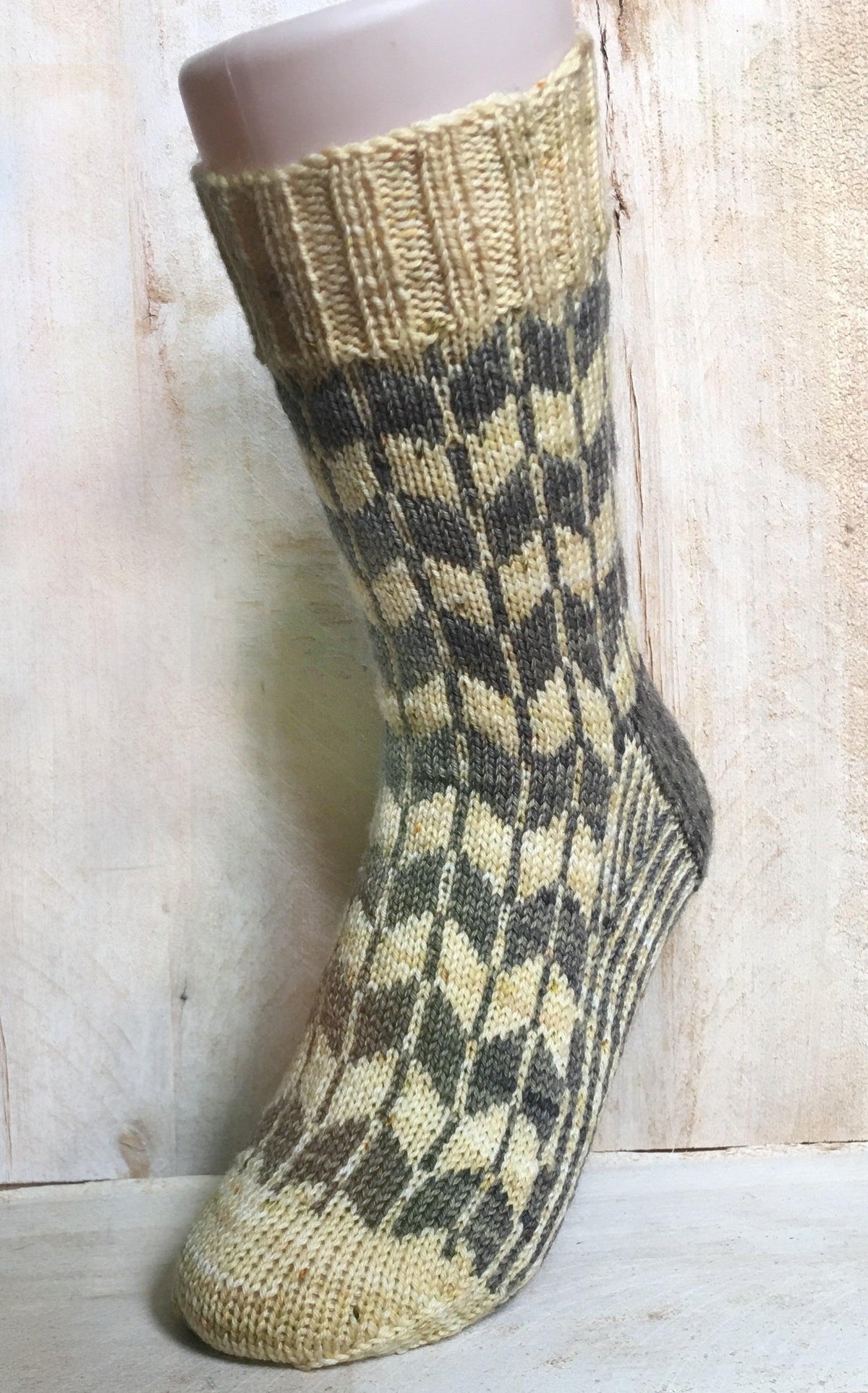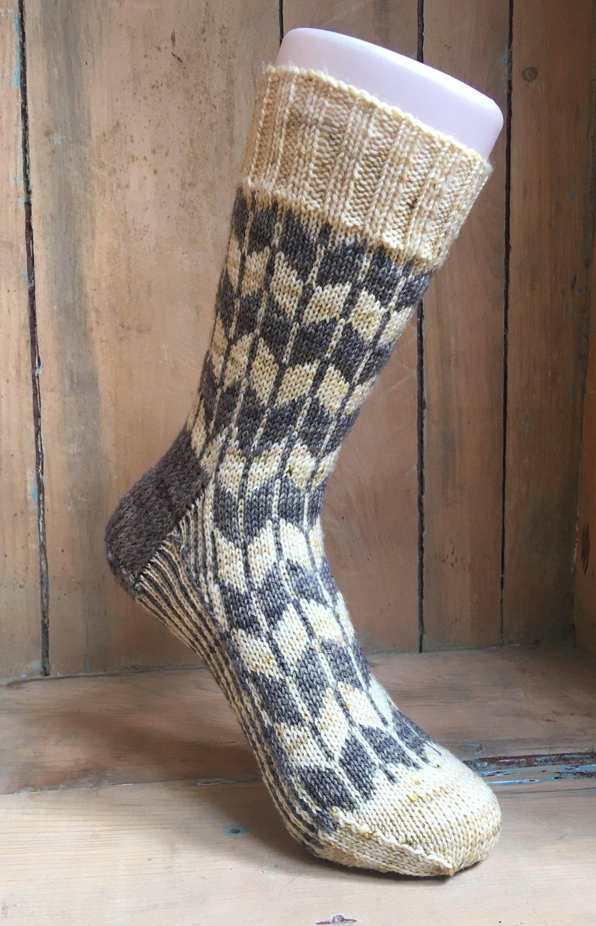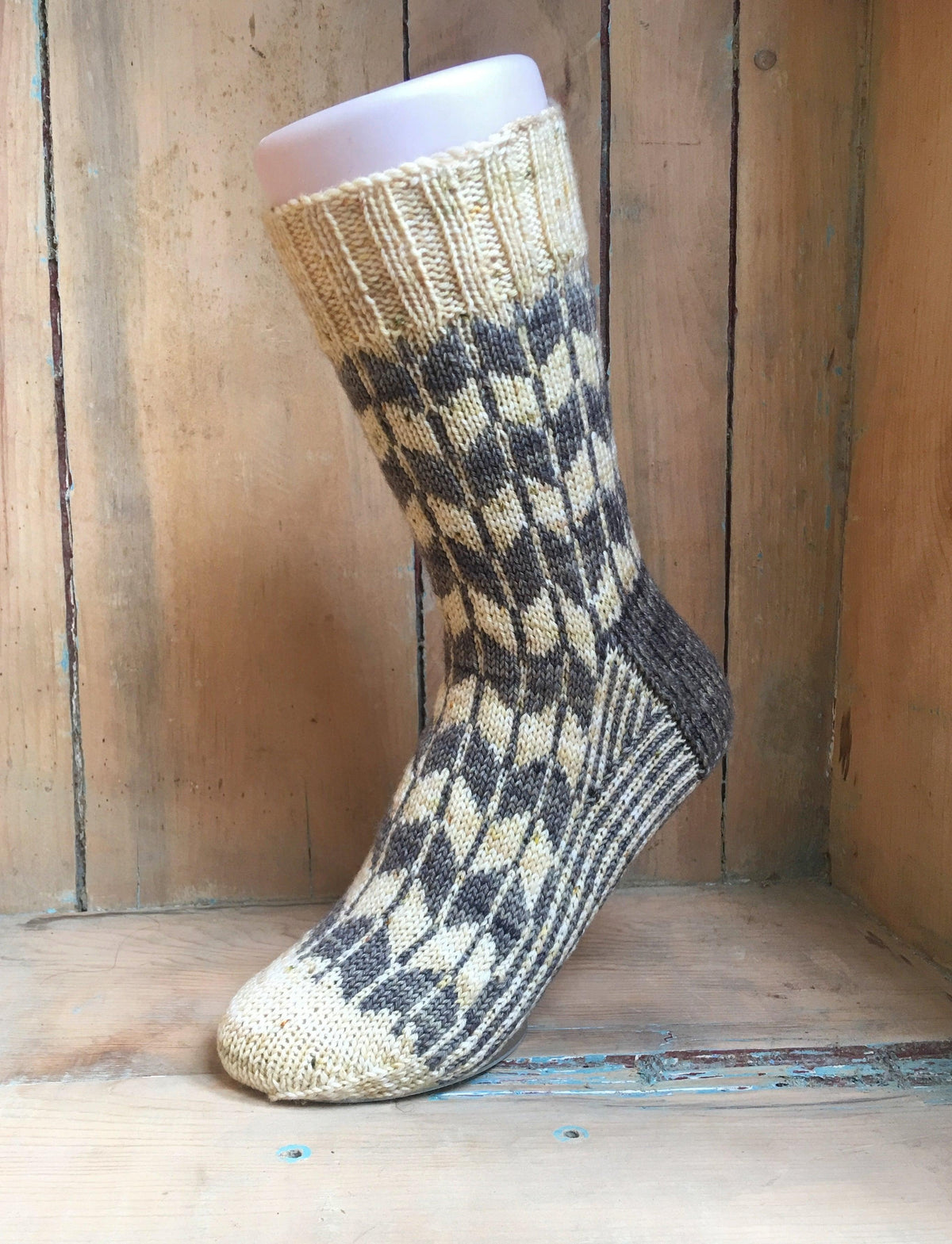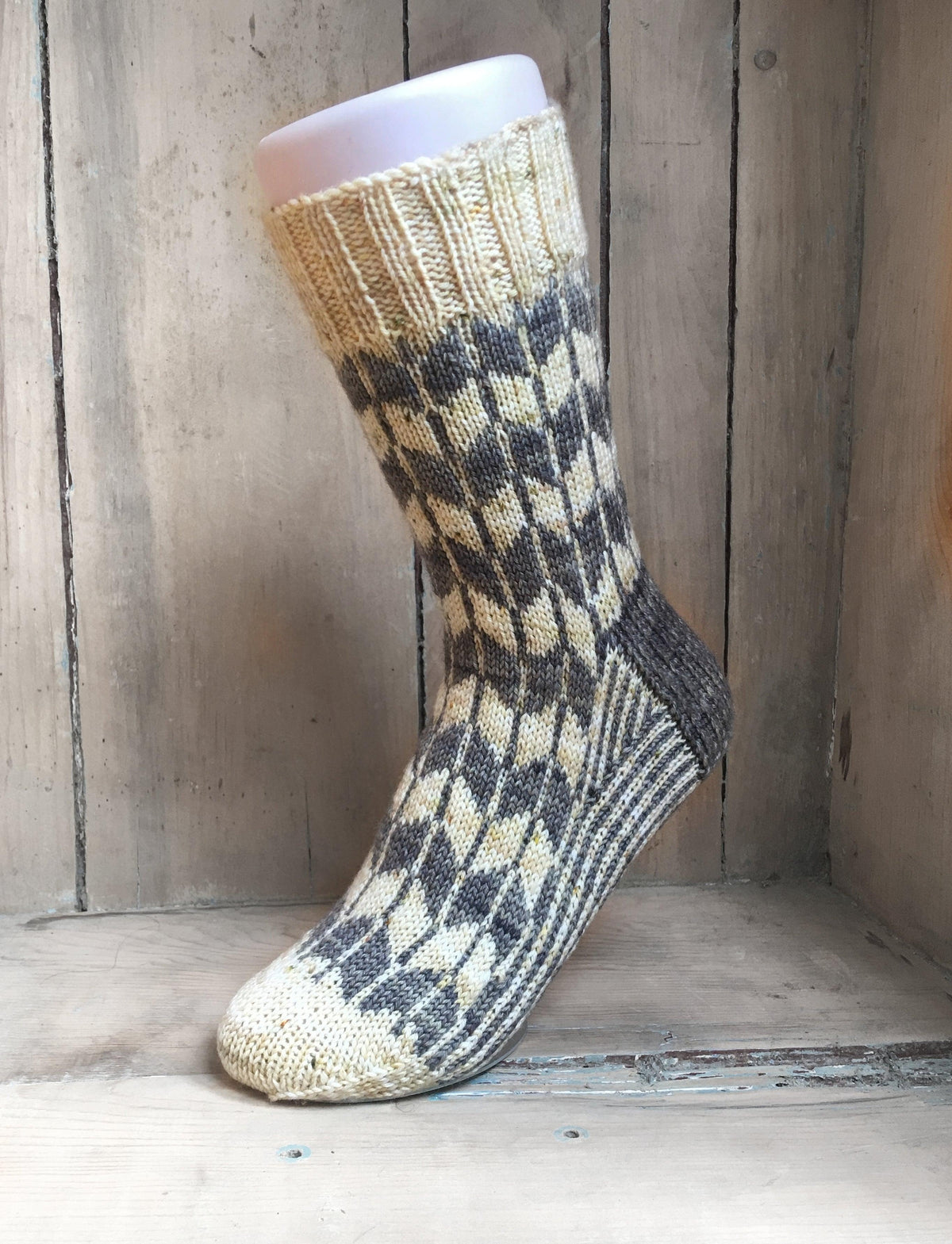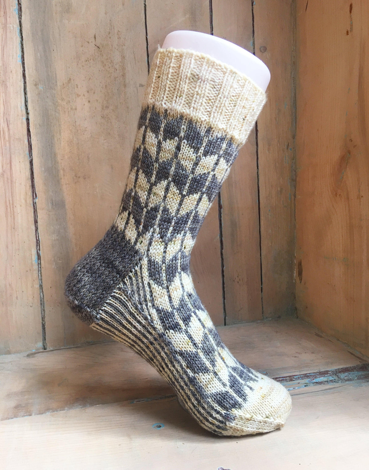 "Here is a reversible and repetitive geometric pattern that is easy to memorize and knit. Shown here in classic colors, I can also see it looking very nice knit in bright and festive colors. " - Louise