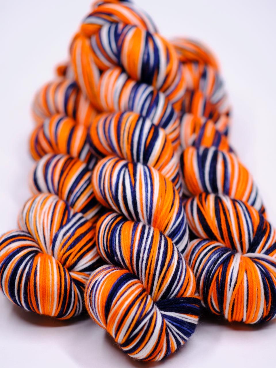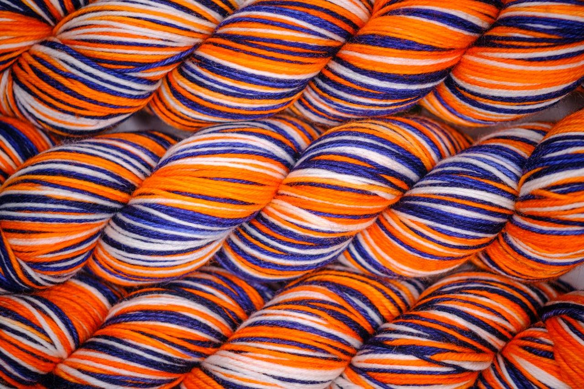 This hand-dyed self-striping sock yarn is made of 85% merino wool and 15% nylon.