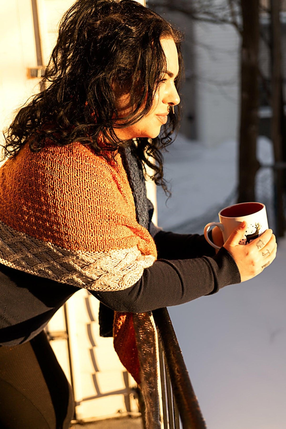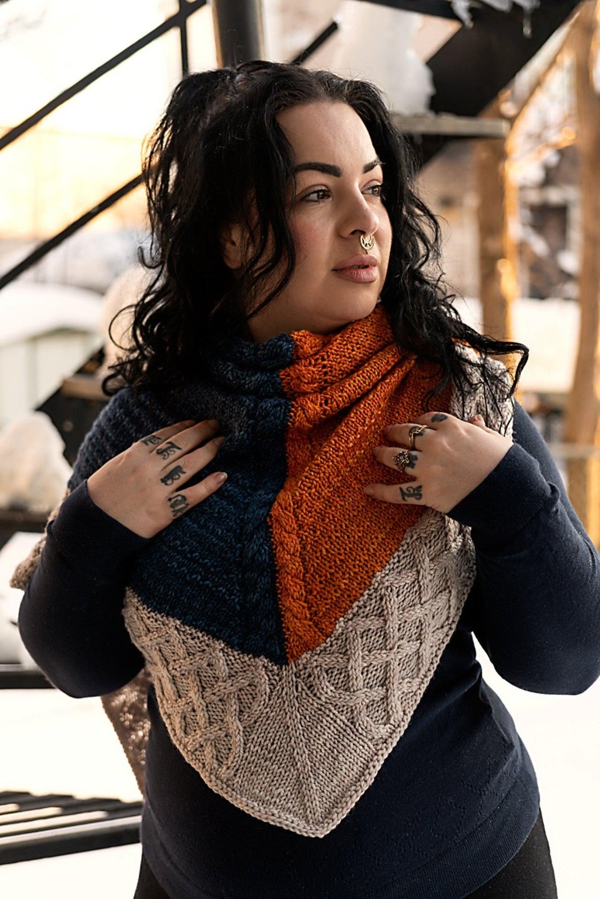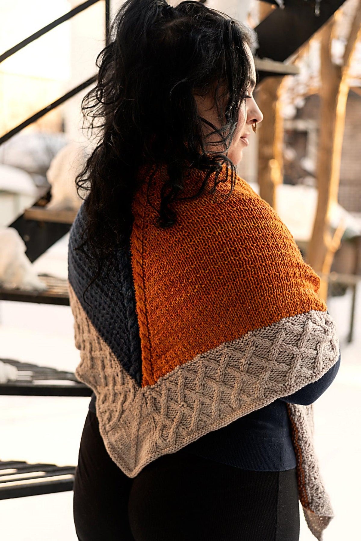 This is a triangular shawl worked in three colors with cables and an Andalusian st pattern.