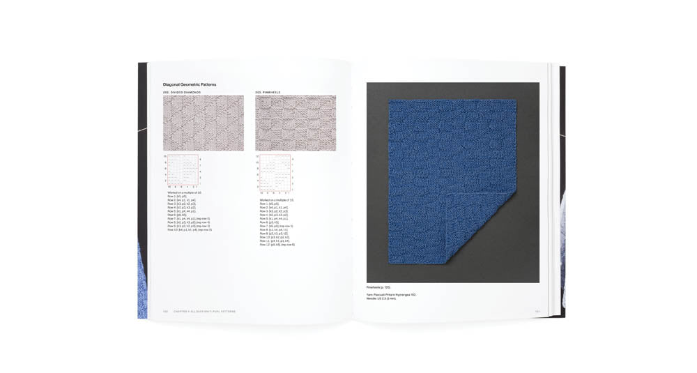 Every pattern in the book has a chart and row-by-row written instructions. While the dictionary is written for flat knitting, it is easy to use the charts to adapt any of the patterns to working in the round.
