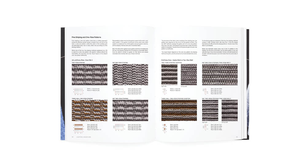 Reversible Knitting is intended to be a true “handbook” in the sense that it is smaller and lighter and feels good in the hand. By going with a sewn binding, a paperback, and a jacket, it will open flat, be easier to carry, and the jacket can do double duty as a bookmark.