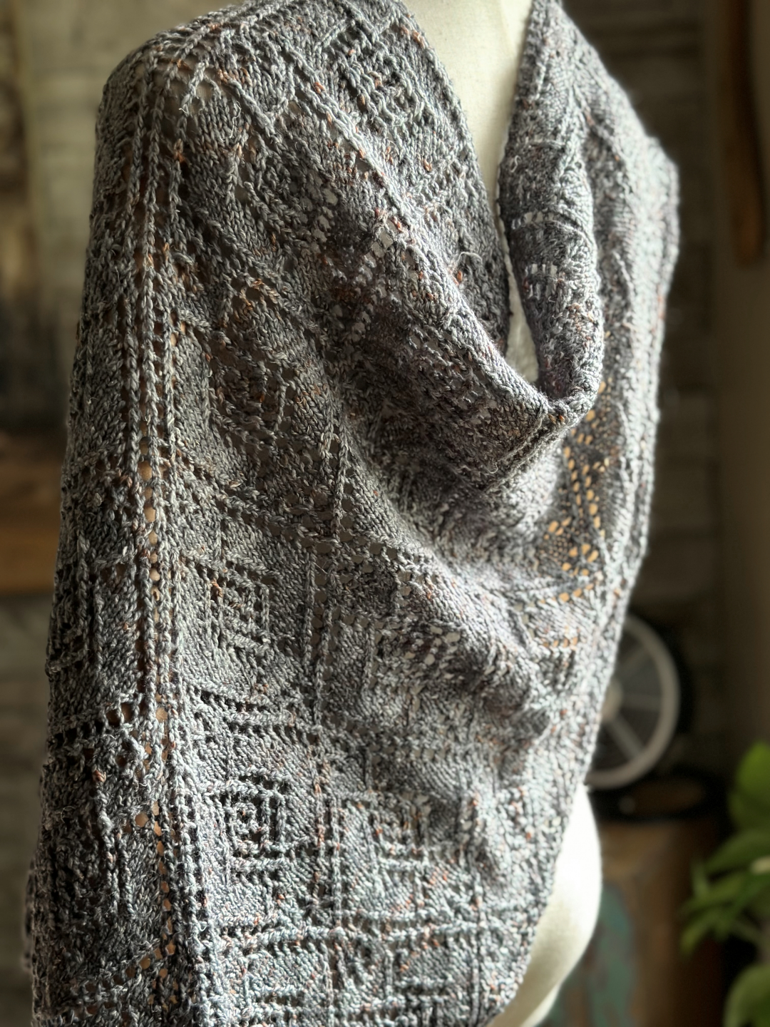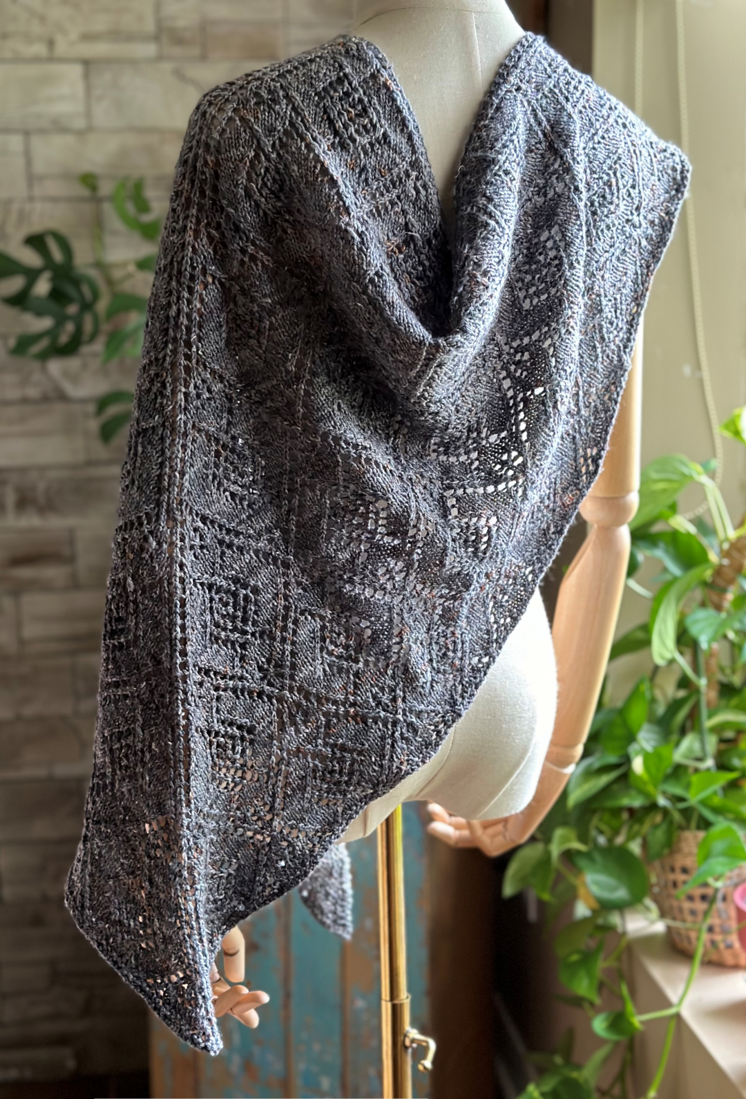"The stunning leaf and diamond geometry of the stitch pattern used in this top-down shawl reminded me of an intricate garden hedge maze, such as the one described in Kate Morton's engrossing novel, The Forgotten Garden." - Rose Beck.