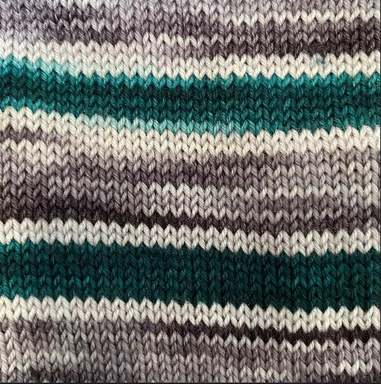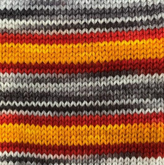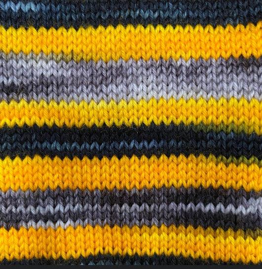 This hand-dyed self-striping sock yarn is made of 85% merino wool and 15% nylon.