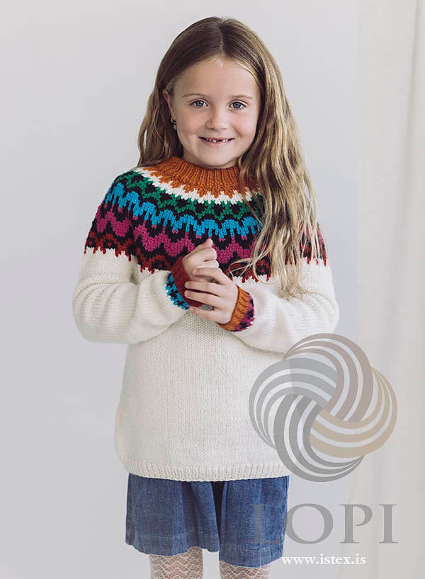 This collection offers a range of knitting projects, including sweaters for men, women, and children, as well as patterns for scarves, robes, skirts, blankets, and hats. The designs use Icelandic wool in various yarn weights and are available in both adult and children’s sizes.
