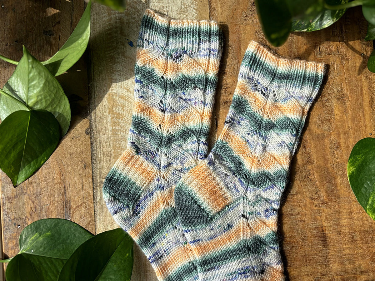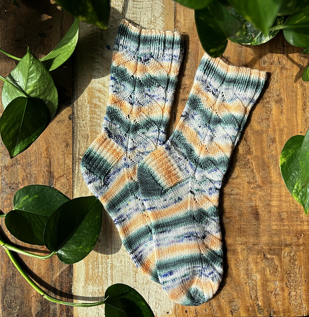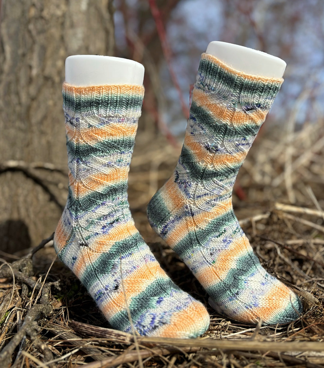 Moutons en vacances, which means "sheep on vacation" in French, looks stunning in semi-solid, speckled, and self-striping yarn. It just shows that sheeps are always happy when they go on holiday! This pattern is worked from the cuff down with a heel flap. The leg and instep are adorned with a lovely stitch pattern that continues seamlessly on the tips of the toes.
