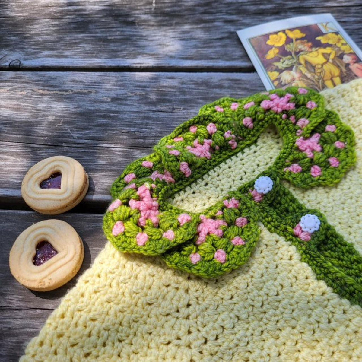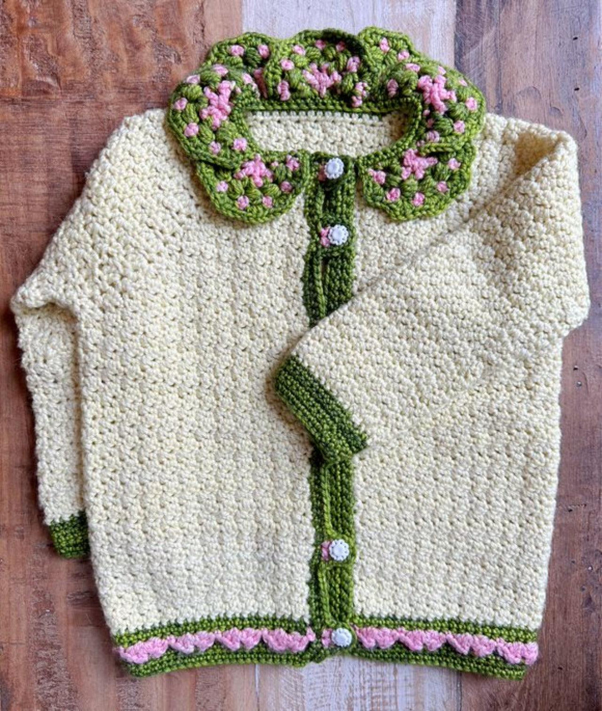Here is a child’s cardigan by Ciara Doyle in soft fresh spring colors with a decorative collar. The collar is created from 7 separate rainbow motifs, which are then crocheted together to form the neckband. The main body of the cardigan is worked top down in one piece.