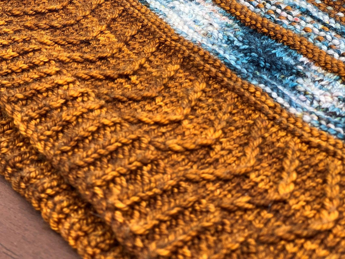 "Biscotte Yarns DK PURE is a blend of 90% Superwash Merino Wool and 10% silk. It absolutely glows from within and inspired this design. The Caramel colorway reminds me of pine needles covering the forest floor on my hiking trails, and the variegated Nelly is the pond partially frozen over with ice. Its colors range from deep teal, representing the cold pond water, to shiny, opaque white like the thick ice.