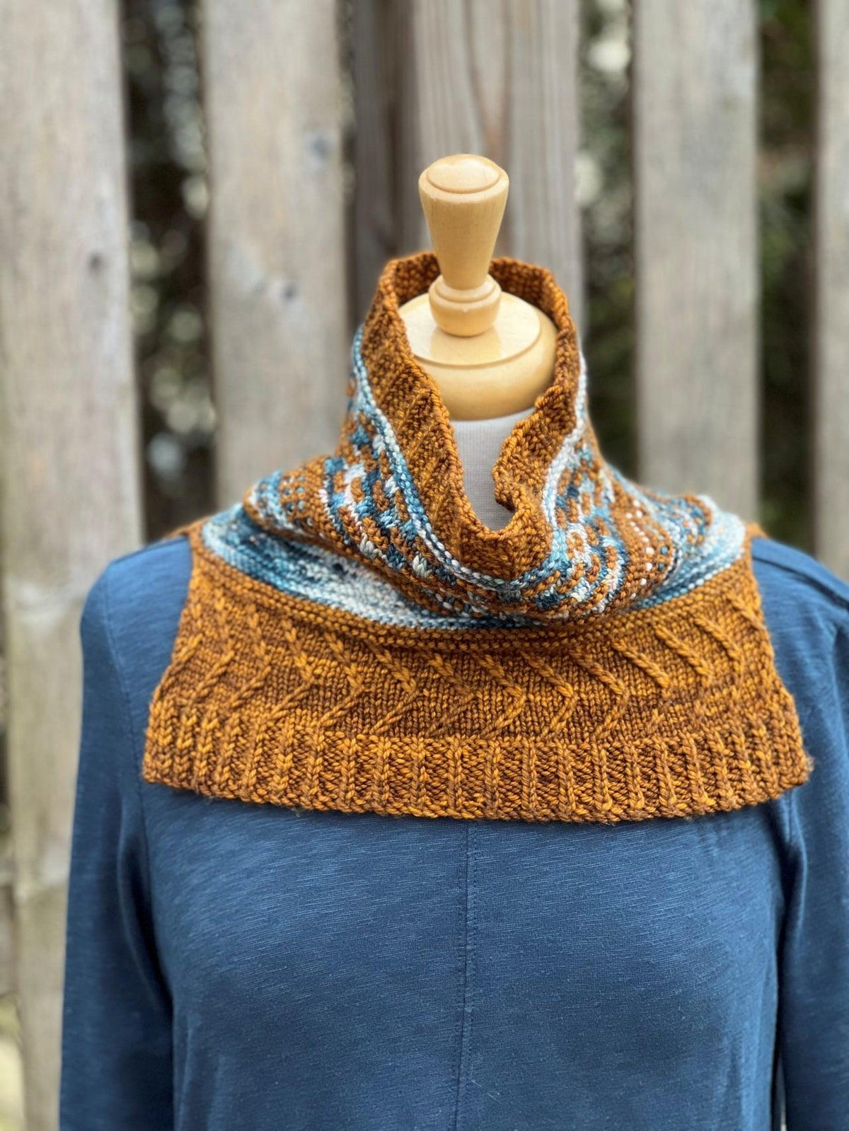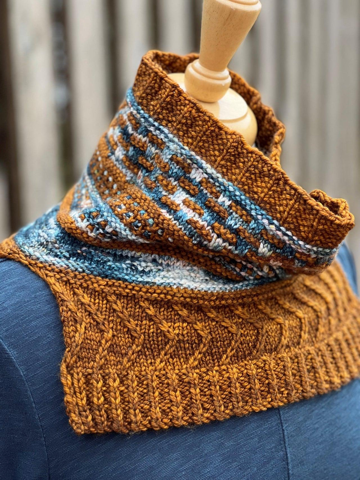 Wintry Woods is the original design in my Friluftsliv Cowl Collection. Friluftsliv (pronounced free-loofts-liv) is a Scandinavian term that translates to "open air living." My designs are often inspired by natural beauty throughout the northeast United States. Embracing the concept that there is (almost) no bad weather, only inadequate clothing choices, I designed these cowls to wear on – and brighten – my outdoor hikes during the seasons we experience from late fall through spring."- Erika