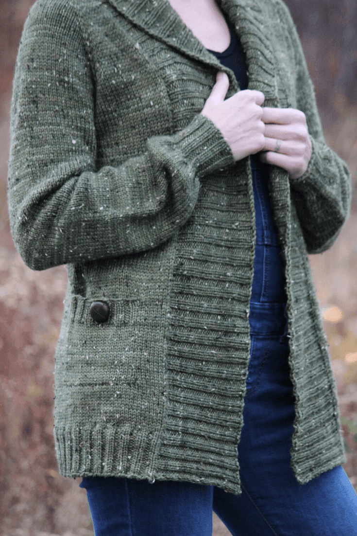 Kalamata is knit seamless from top to bottom. The sleeves are knit in the round without any decreases until the first round of the cuff so that the sleeves will have a loose fit with a fitted cuff. The body is knit even in Stockinette Stitch with Patch Pockets attached after the body is finished. Stitches are picked up using long circular needles starting at the right front bottom edge continuing around to the left front bottom edge with a few short rows around the neck to raise the collar. To see a tutorial on the Patch Pockets click HERE.