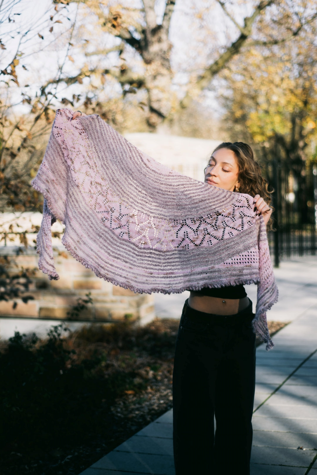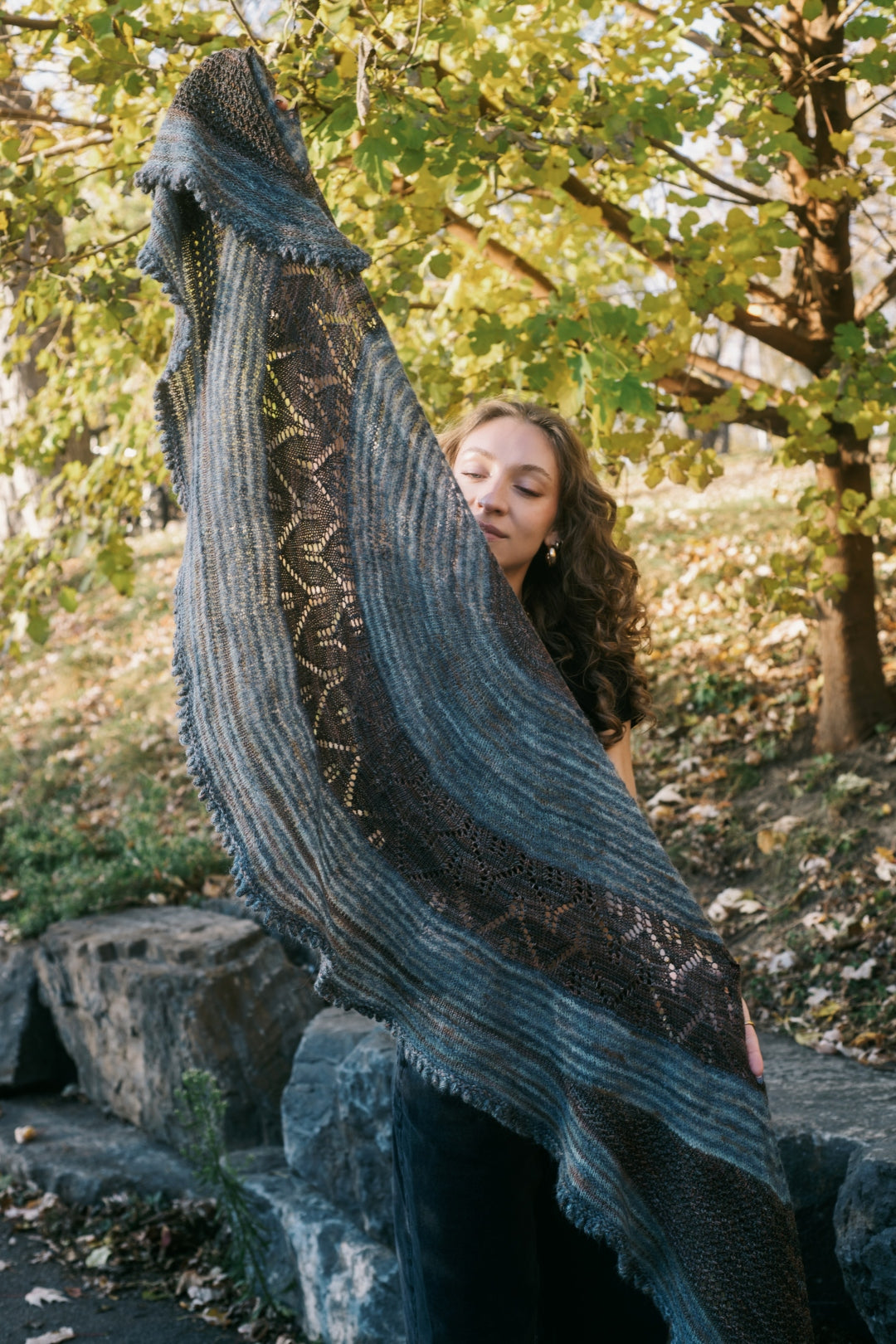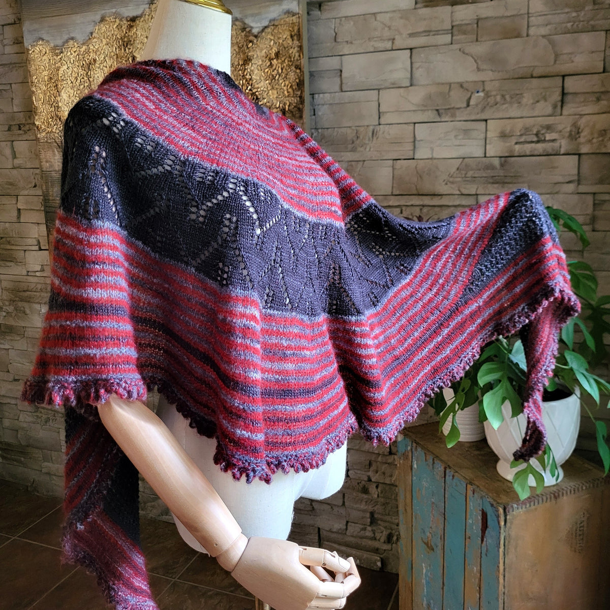 The traditional, feminine silhouette of the shawl is updated with a lace band located in the center instead of at the edge and is further enhanced by varying yarns, textures, and colors.