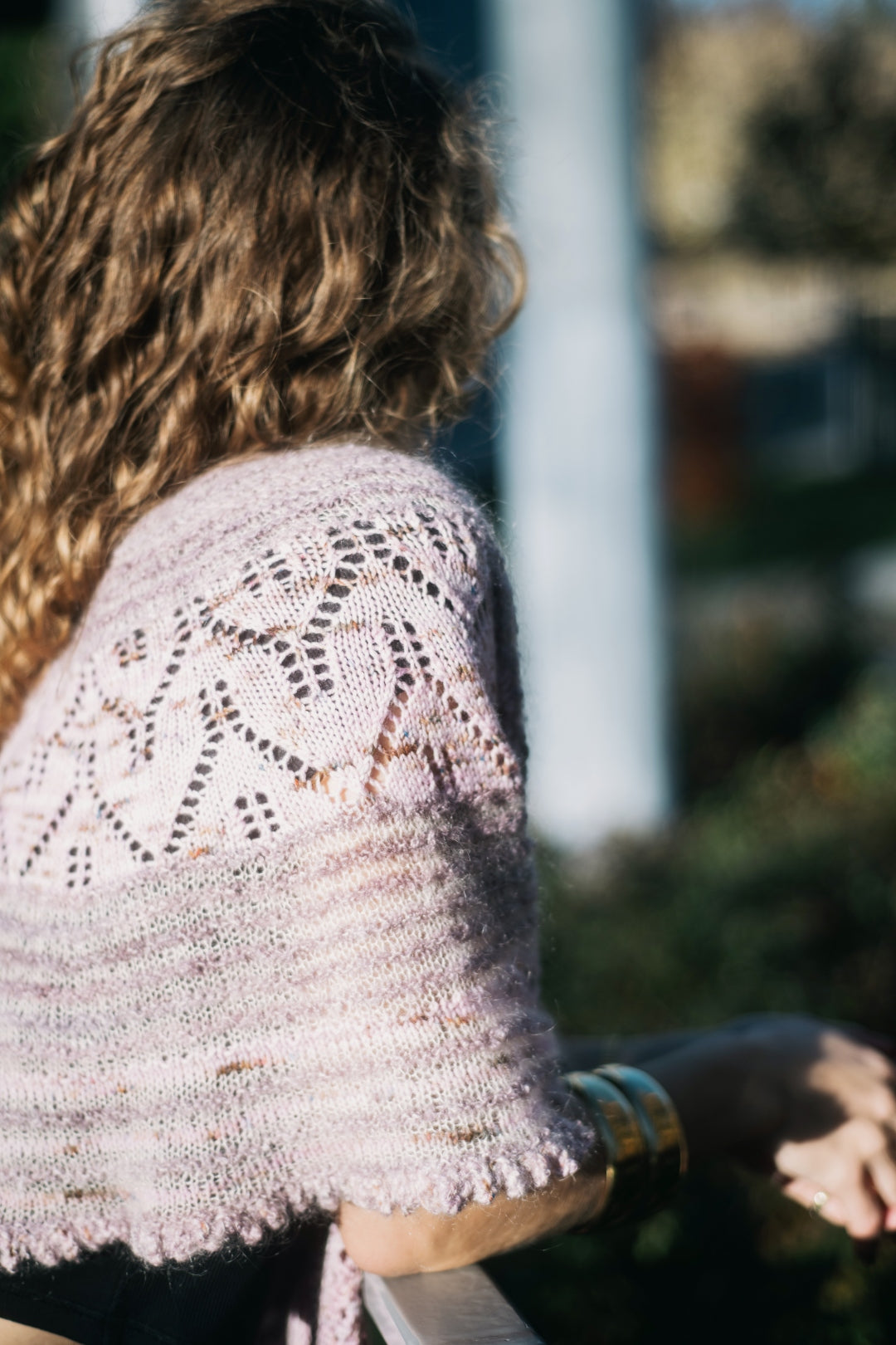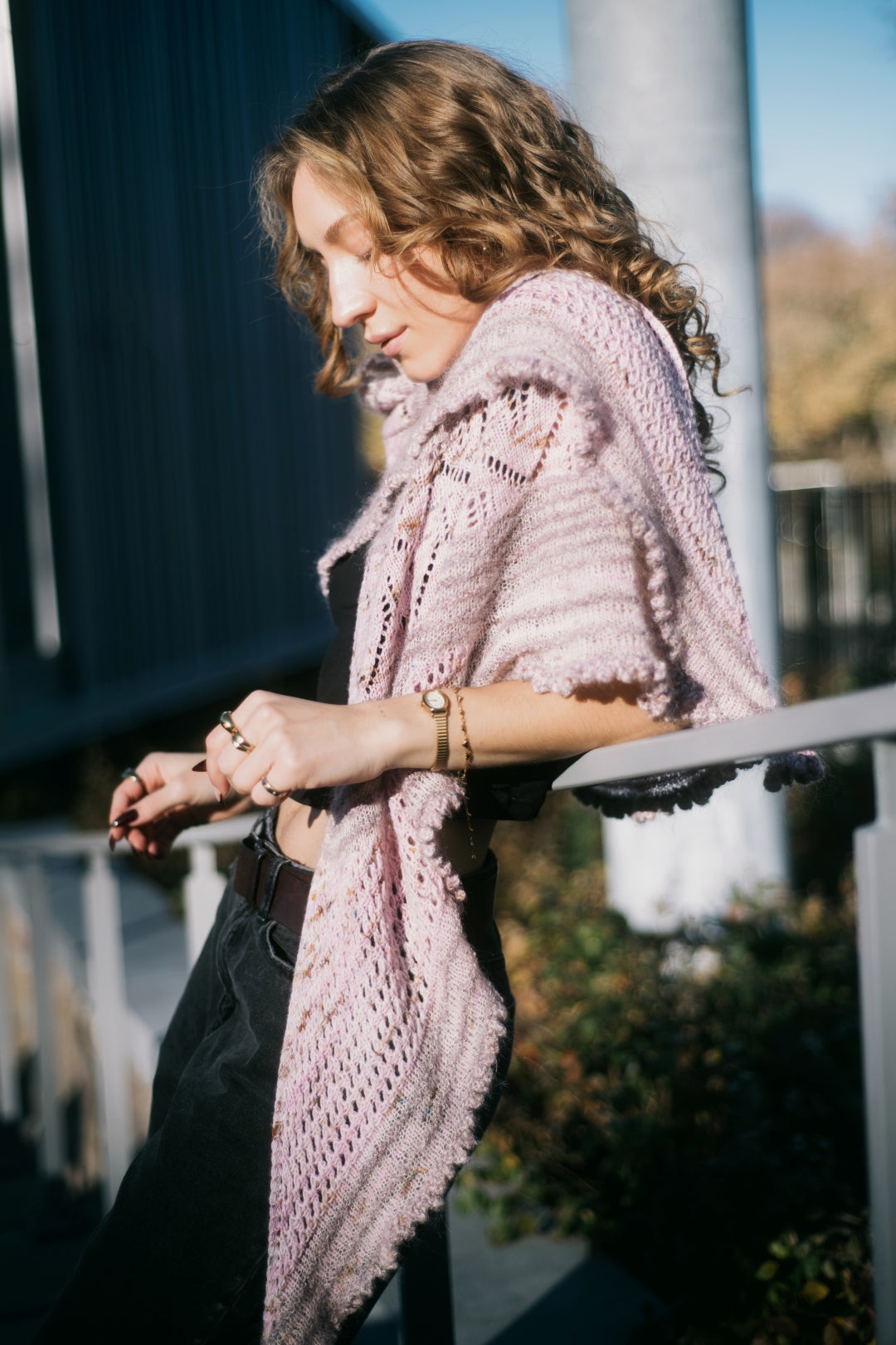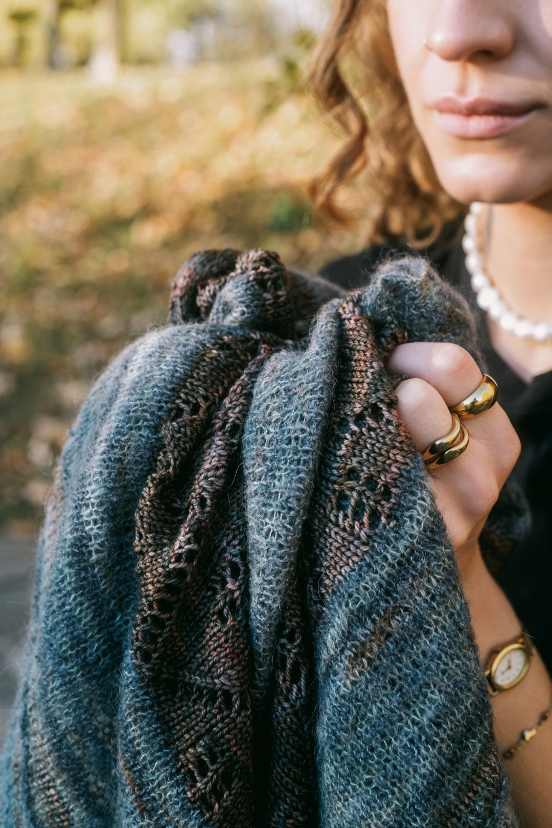 The traditional, feminine silhouette of the shawl is updated with a lace band located in the center instead of at the edge and is further enhanced by varying yarns, textures, and colors.
