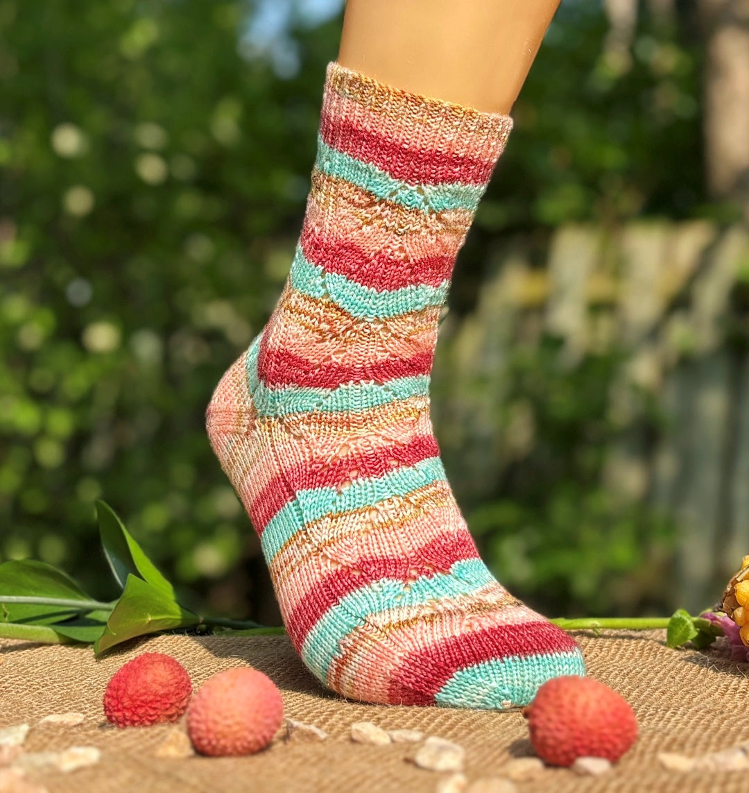 These delightful socks are crafted from the cuff down with an afterthought heel. The unique self-striping Sea Bloom yarn will make you fall even more in love with this piece.