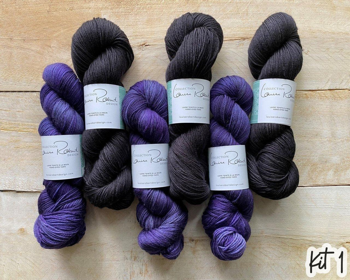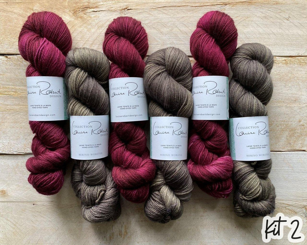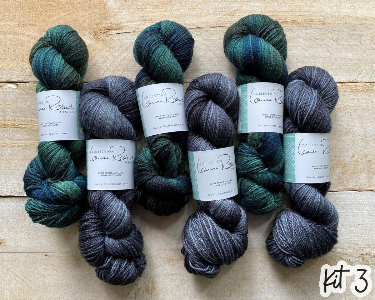Each kit contains a total of 600 grams* of Louise Robert Design Collection - Super Sock (75% merino sw yarn and 25% nylon | 400 meters per 100 grams) in the following colours :