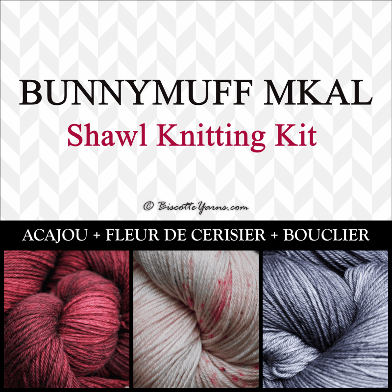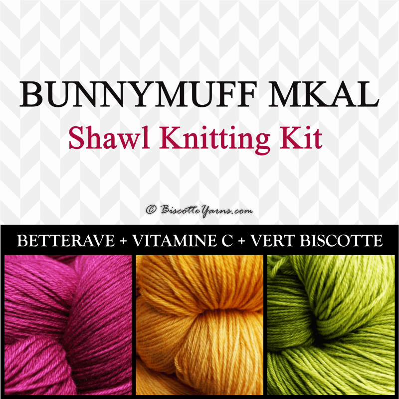 Bunnymuff May 2018 MKAL shawl was designed specifically for Biscotte Yarns Bis-sock mini skeins. This is a pattern for a bias shawl worked from the ‘bottom-up’.
