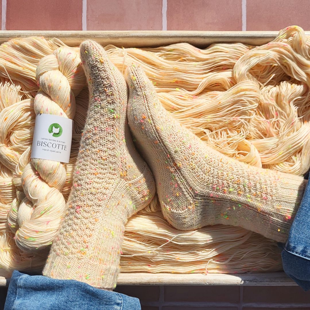 Combining my 2 favorite things, yellow yarn and texture, the socks came to be! I started these socks at a time when I needed something easy to memorize but also that little something to keep me engaged. I love how these turned out so much that I’ve made them multiple times. I hope making them brings you as much joy as they did me. - Andrea Yetman