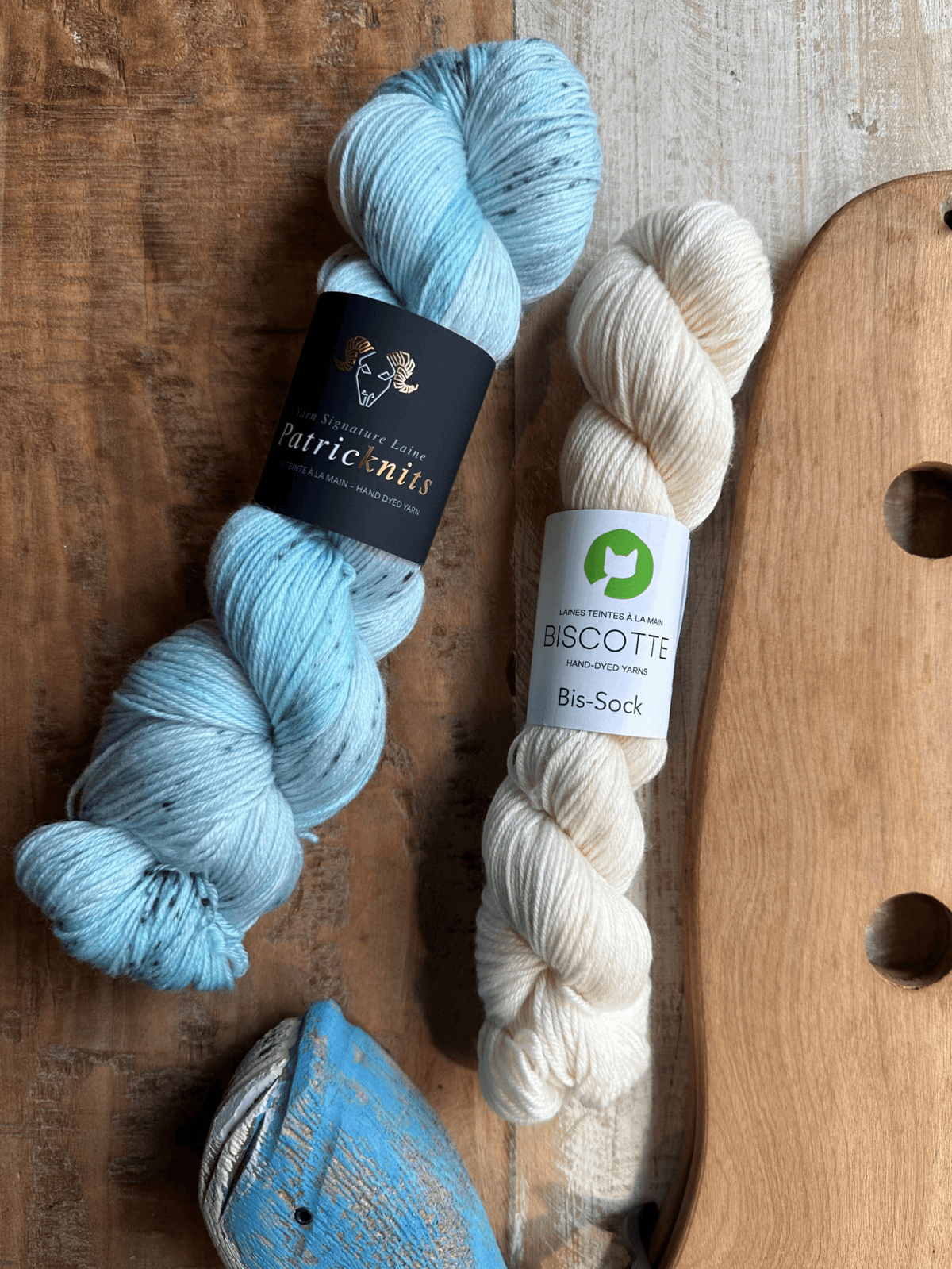 THIS KNITTING KIT INCLUDE THE WATER SLIDE SOCKS PATTERN AND THE FOLLOWING YARN TO KNIT THESE WATER SLIDE SOCKS :