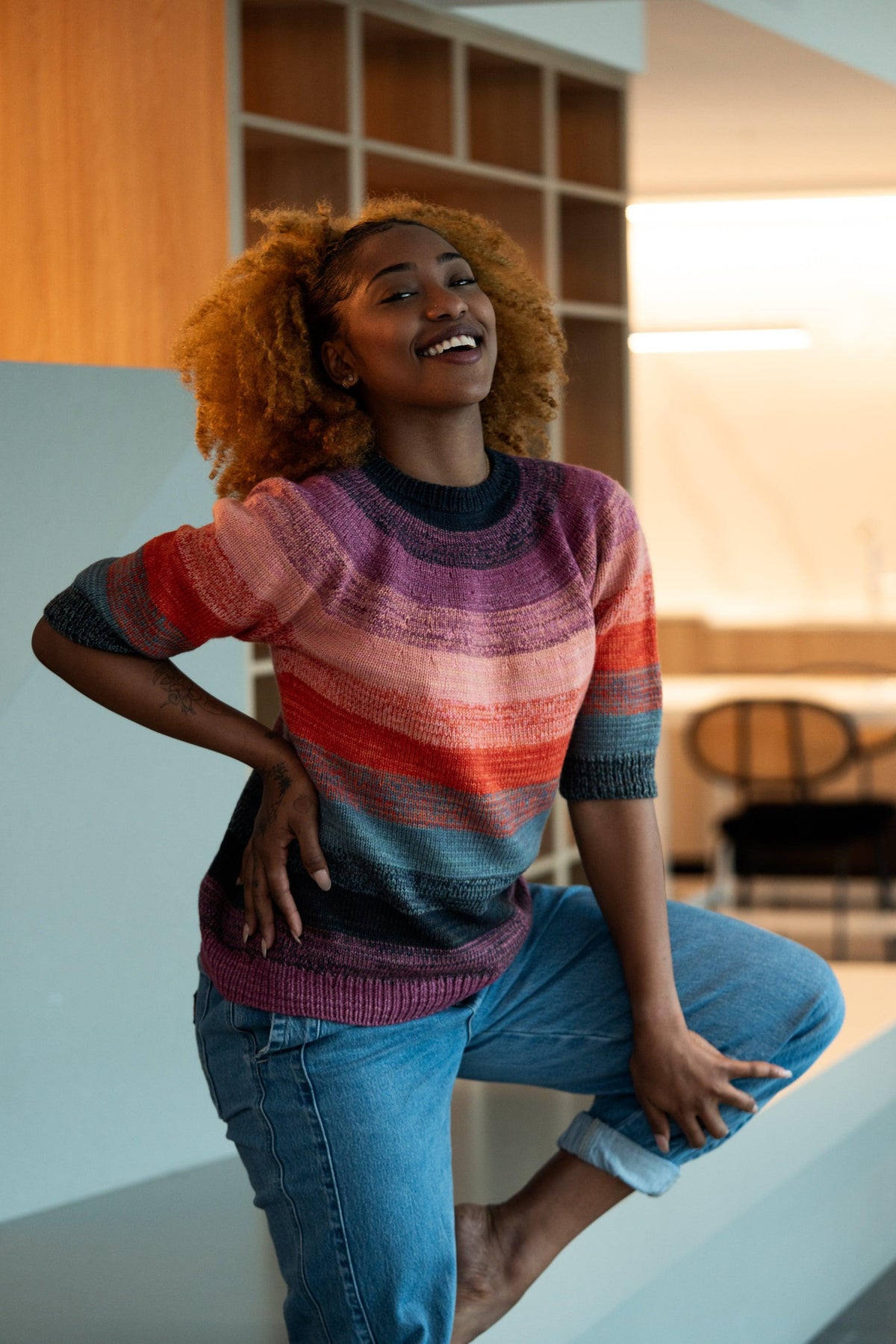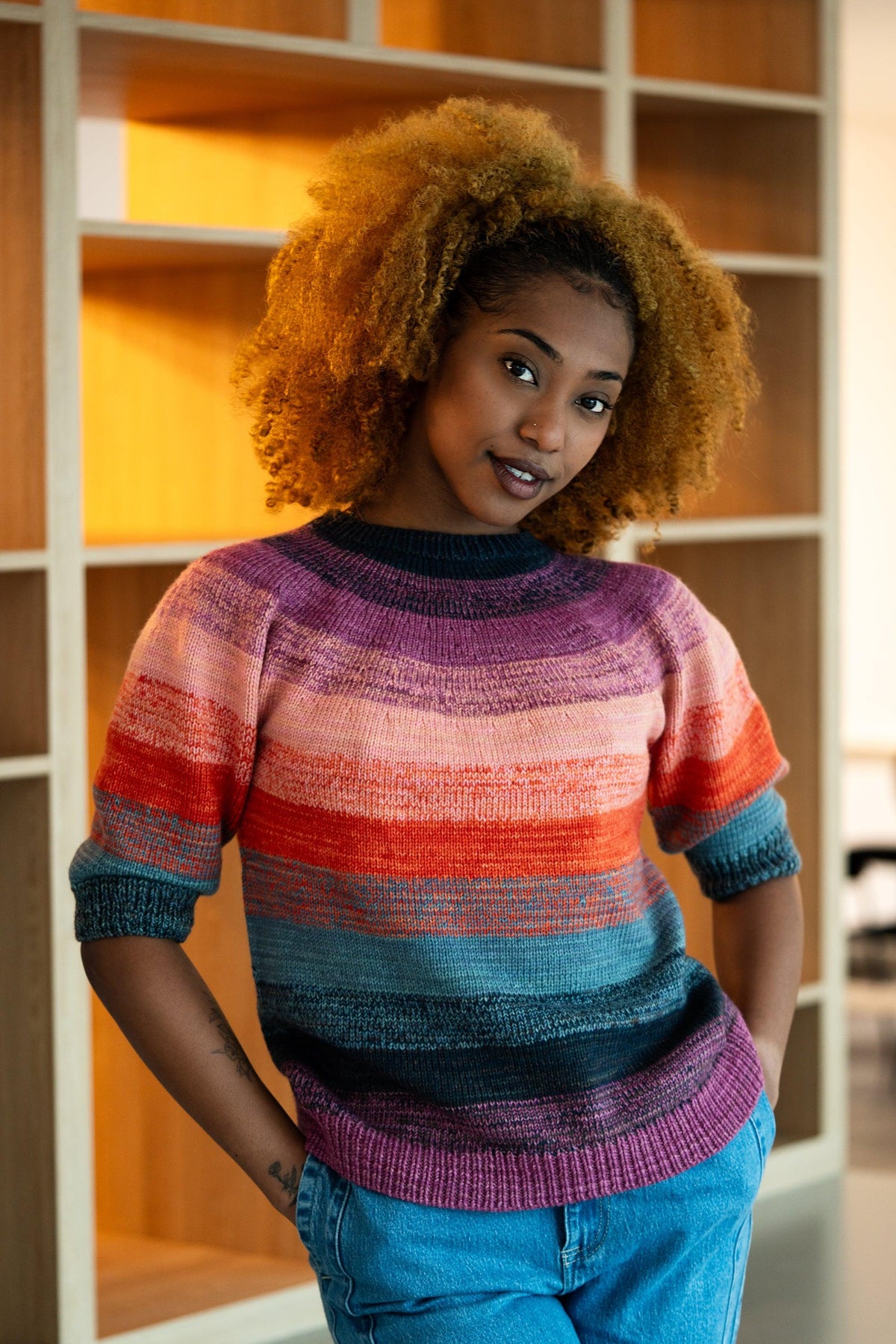 This sweater is knitted top-down and in the round. You can adjust the length of the body and sleeves as needed, keeping in mind that you will also need to adjust the amount of yarn required accordingly to knit the sweater.