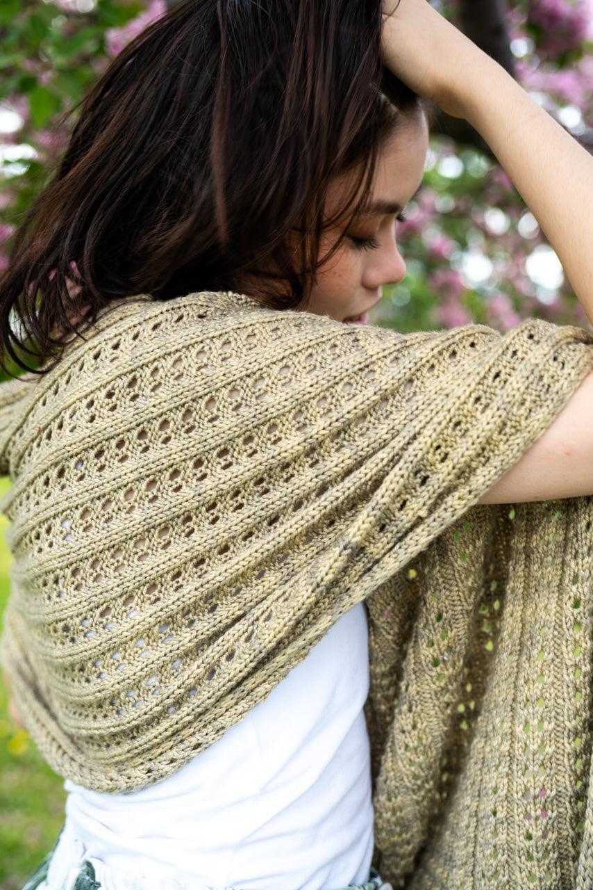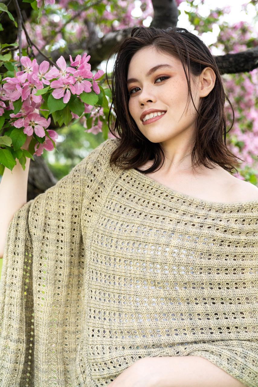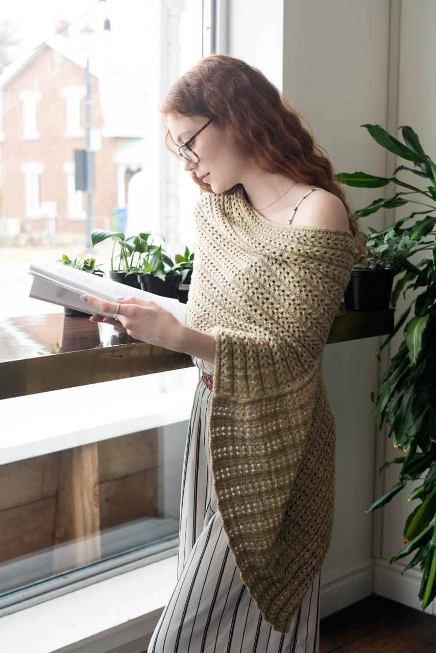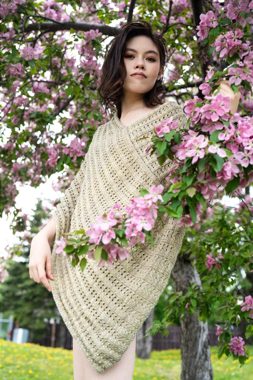 This poncho is a very simple knit with just a four-row pattern repeat (with only one row that requires more attention) so it’s perfect for a relaxing knit. Worked in Merino Worsted yarn from the Louise Robert Collection, it’s a pleasure to knit such a soft and lovely yarn. The poncho also features a simple 3-stitch Icord edging and, when complete the bind-off edge is sewn to the side to create the poncho shape (or, for the wrap, left open and unseamed).