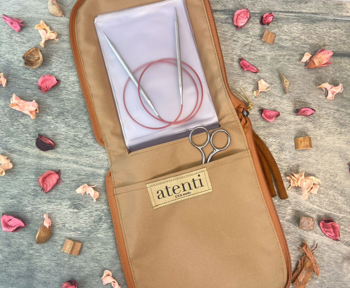 The Bloomette circular needle case features a soft floral print on woven fabric.