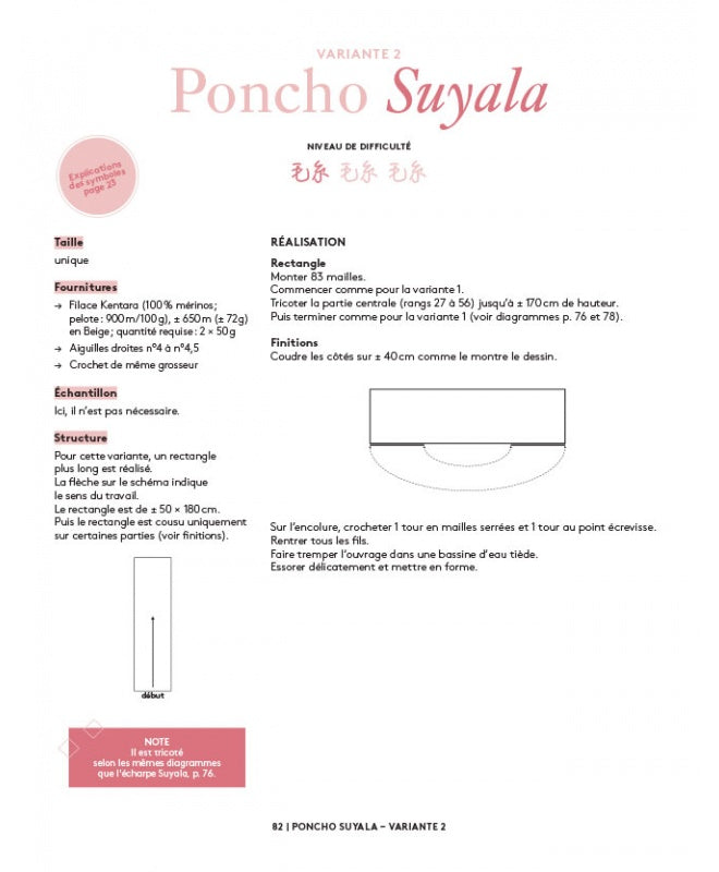 Enfin, les projets sont classés en 3 niveaux de difficulté : débutant, intermédiaire, expérimenté. Ainsi, vous pouvez tricoter un châle ajouré adapté à votre expertise !