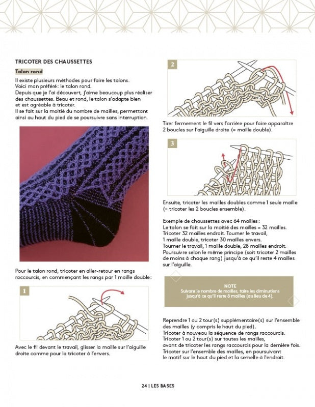 Elle détaille également la méthode pour tricoter des chaussettes et les modèles proposés dans ce livre de 160 pages, qu’il s’agisse d’un accessoire (étole ou châle au tricot) ou d’un vêtement (gilet ou pull top down).