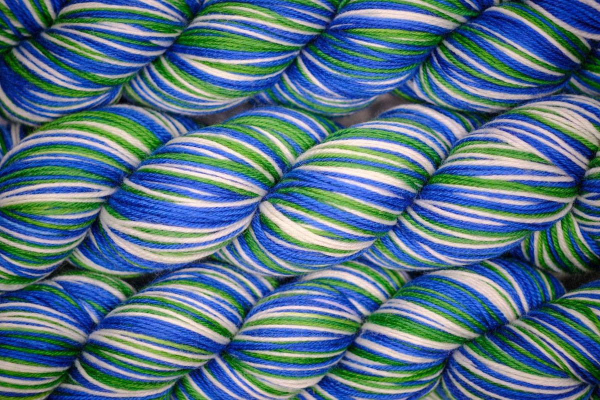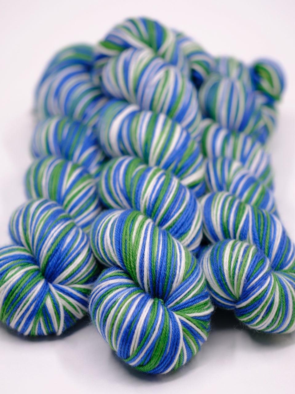 This hand-dyed self-striping sock yarn is made of 85% merino wool and 15% nylon.
