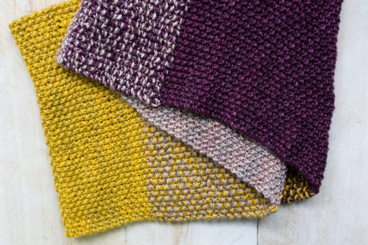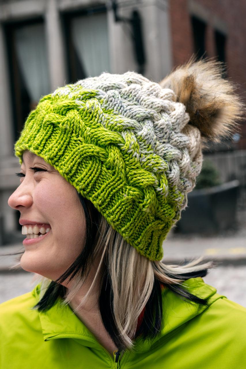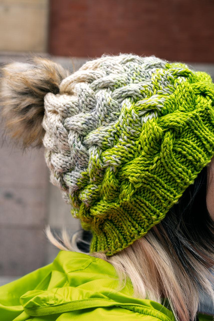 This Hat & Scarf set is made with three skeins of DK Pure, all of different colors. The hat is knit entirely with 2 strands (held double) while alternating colors to create a gradient, funky style. The scarf then uses the rest of the yarn to complete the set. The pompom is optional of course, but admit it - it's really cute!