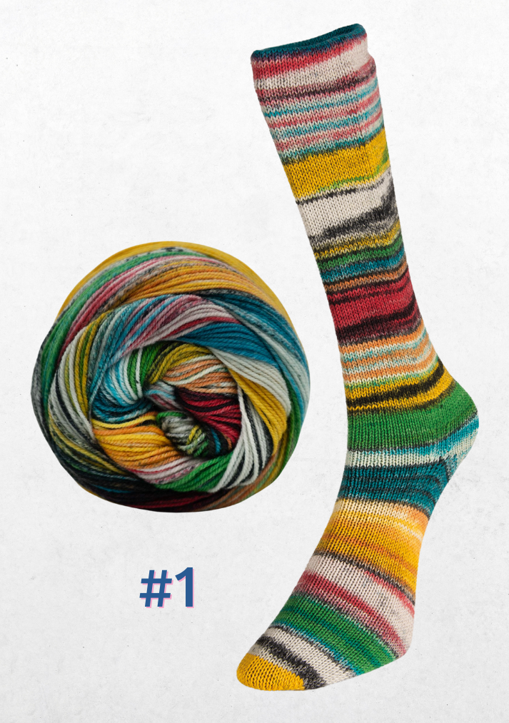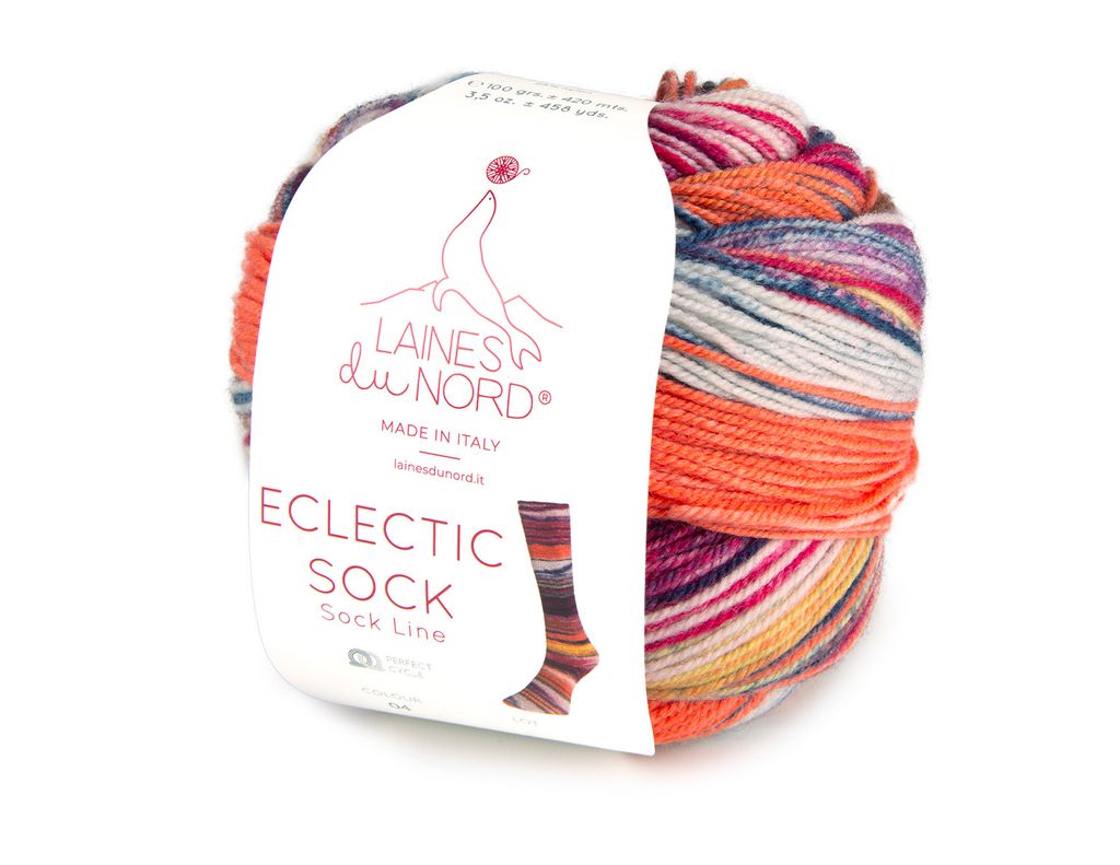 Using just one ball of Eclectic Sock yarn, you can knit two identical socks. This is possible due to their perfect loop philosophy, which includes a section of white yarn in the center of the ball. This white yarn indicates where the first sock ends and the next one begins.