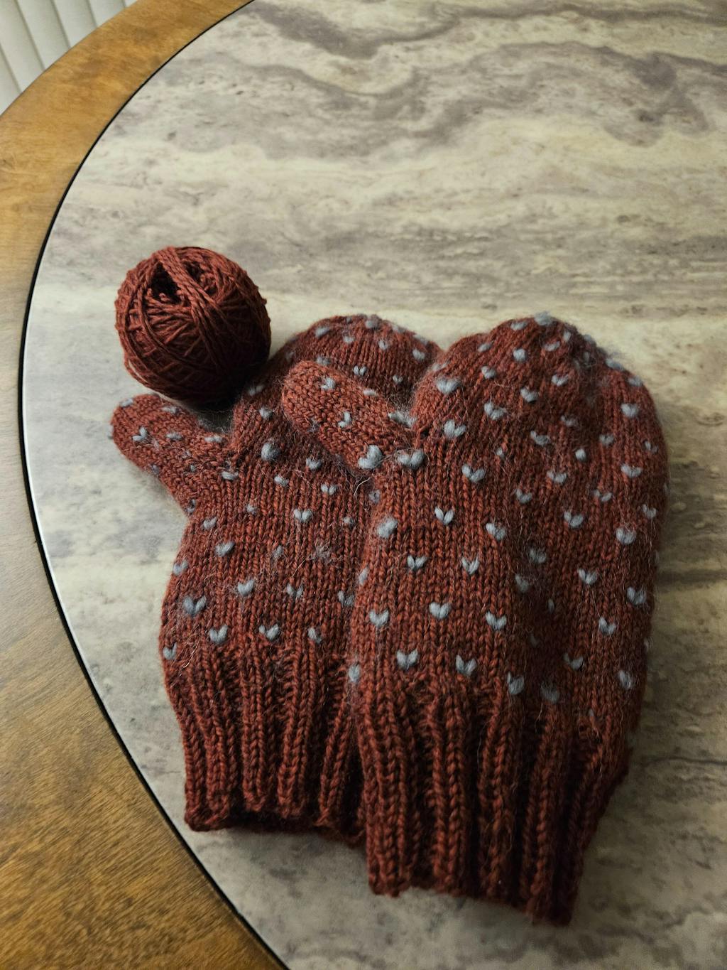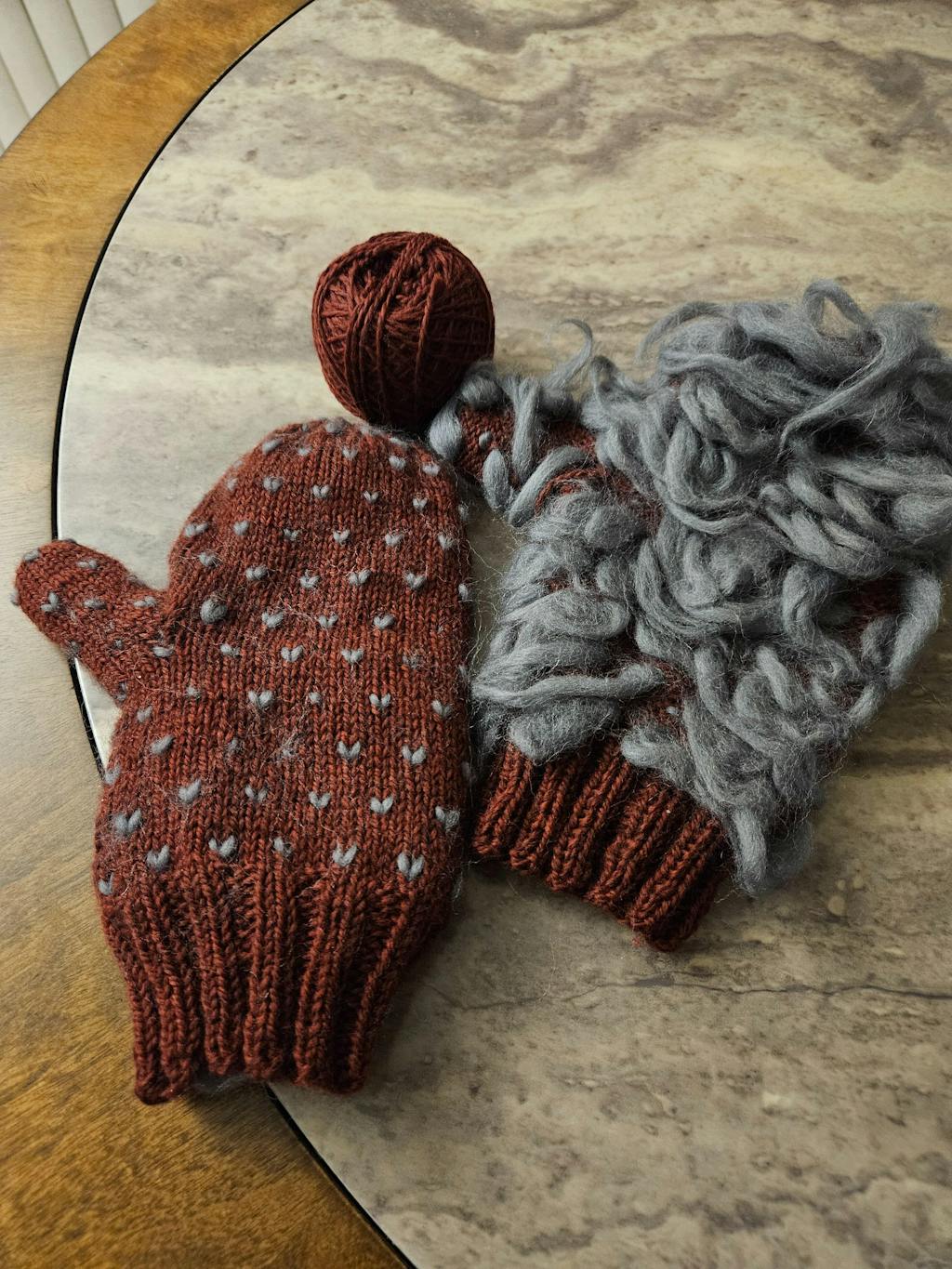 There is no left and right mittens for this pattern: they are both worked identically. At first, you may feel a bit tight in the mitt, but the roving will eventually compress against the inside of the mitt and your mittens will become insulated and very warm!
