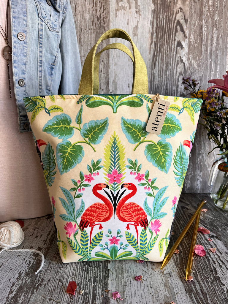 This project bag is nice and roomy! It features a printed flamingo pattern. The top rolls down for easy project access with a wide opening with two handles. Each Atenti project bag is fully lined with their water repellent taffeta and contains 3 inside pockets.