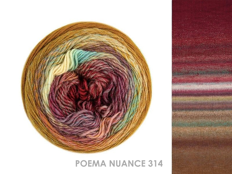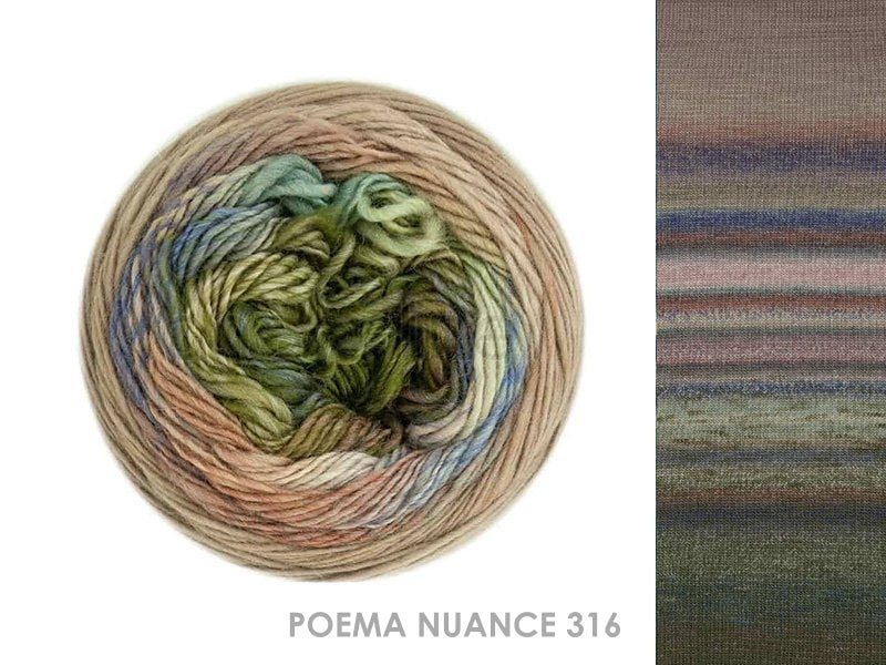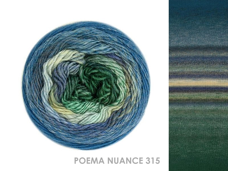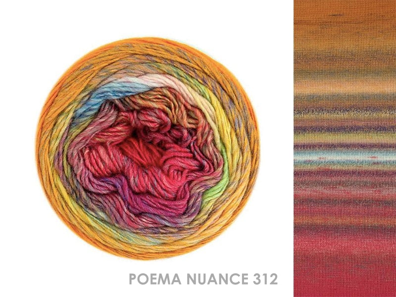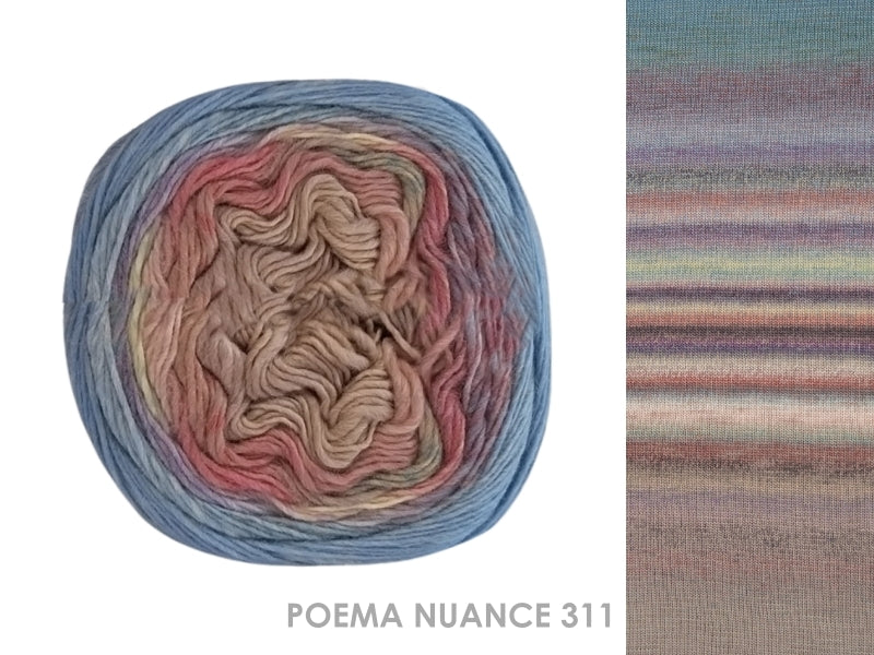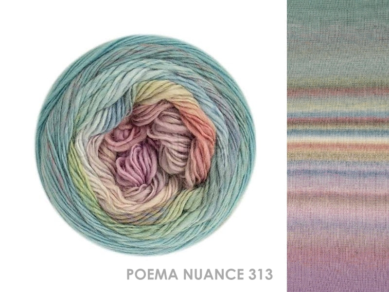 Poema Nuance transforms, evolves and turns into an iconic yarn; created to wrap up and relieve tension through its voluptuous softness; it is ideal for making shawls with the classic degradé effect. The intriguing pattern created by the delicately sophisticated plays of colour will surprise you.