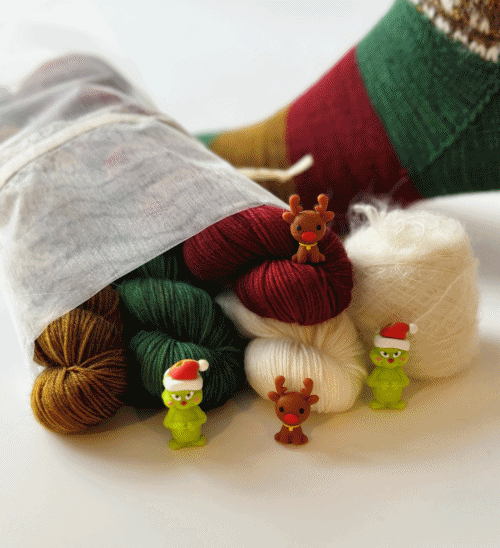 Louise Robert is back with a delightful new festive socks pattern and kit, complete with exclusive needle stoppers! What better occasion than Christmas to knit a cozy pair of socks for yourself or a loved one? This enchanting pattern beautifully combines a rich palette of colors and luxurious yarns, adding a touch of texture and mosaic design that will keep you immersed in the holiday spirit!